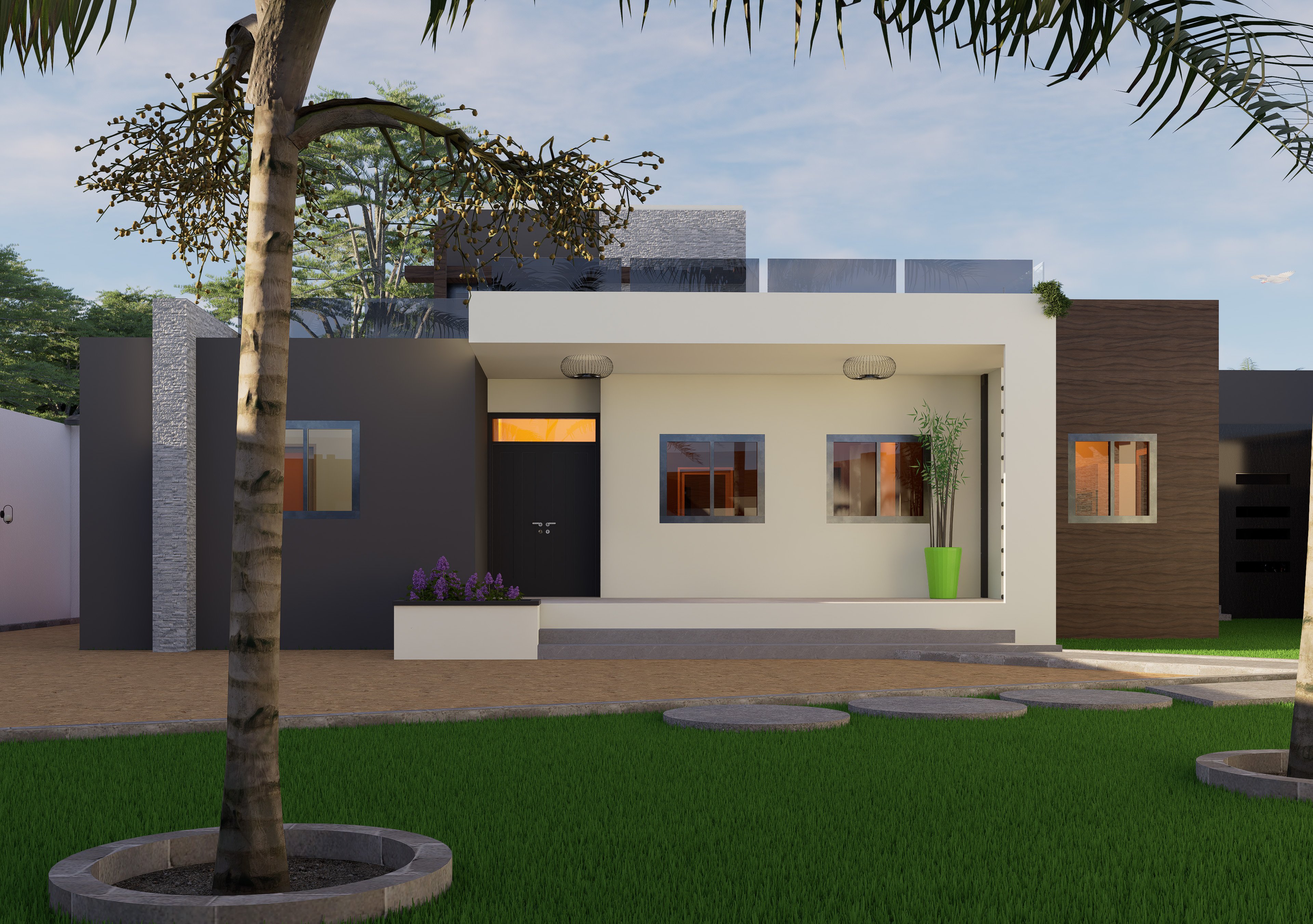 La rénovation a transformé la maison initialement inachevée en une habitation moderne et accueillante. Les espaces intérieurs sont fluides et lumineux, tandis que les aménagements extérieurs — jardin paysager avec palmiers, terrasse et pas japonais — renforcent l’esthétique et le confort. La création d’un garage pour deux véhicules, d’une guérite et d’une clôture repensée apporte fonctionnalité et sécurité. L’ensemble dégage aujourd’hui une identité harmonieuse et contemporaine, fidèle aux objectifs de modernisation et de valorisation de la maison.