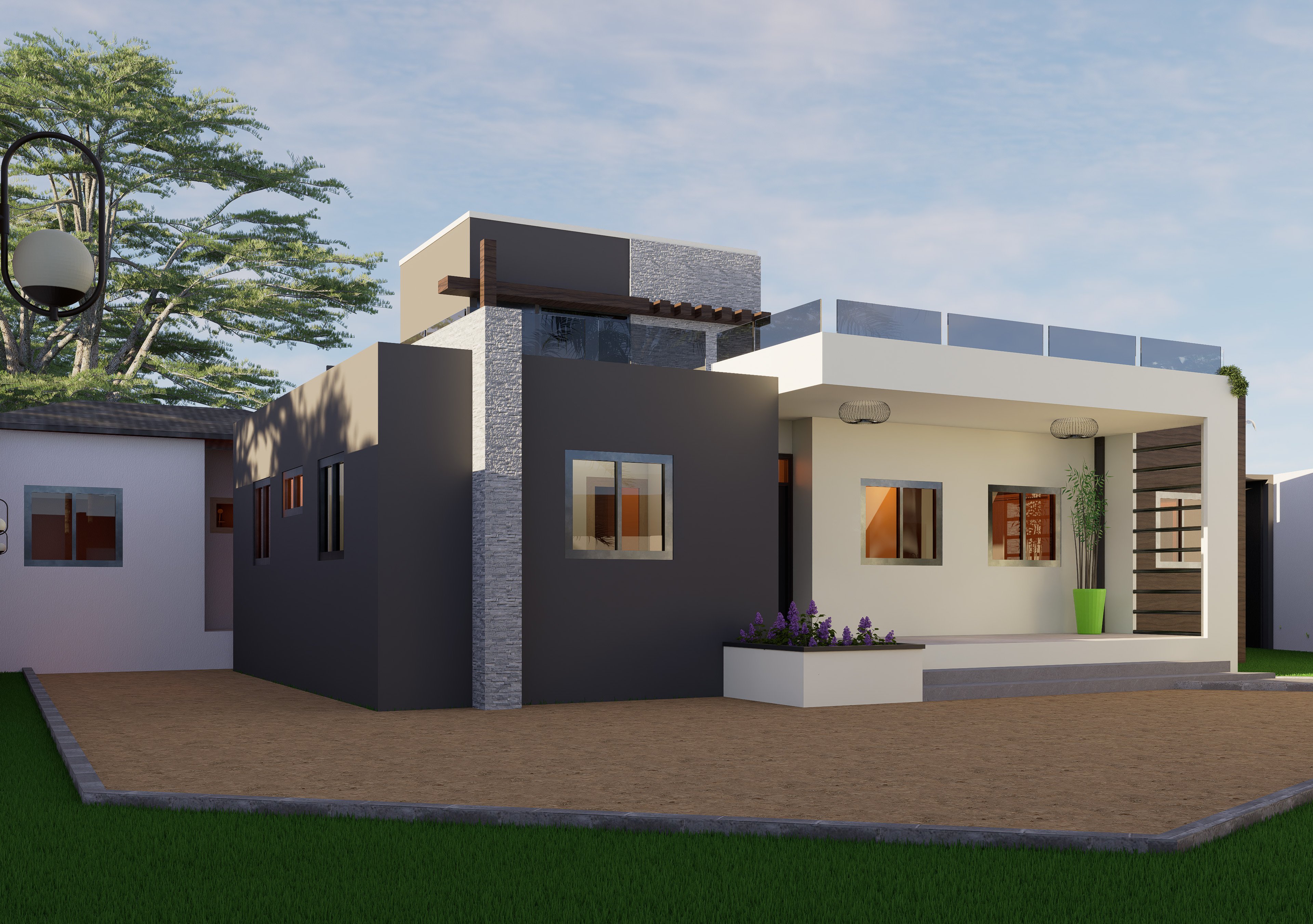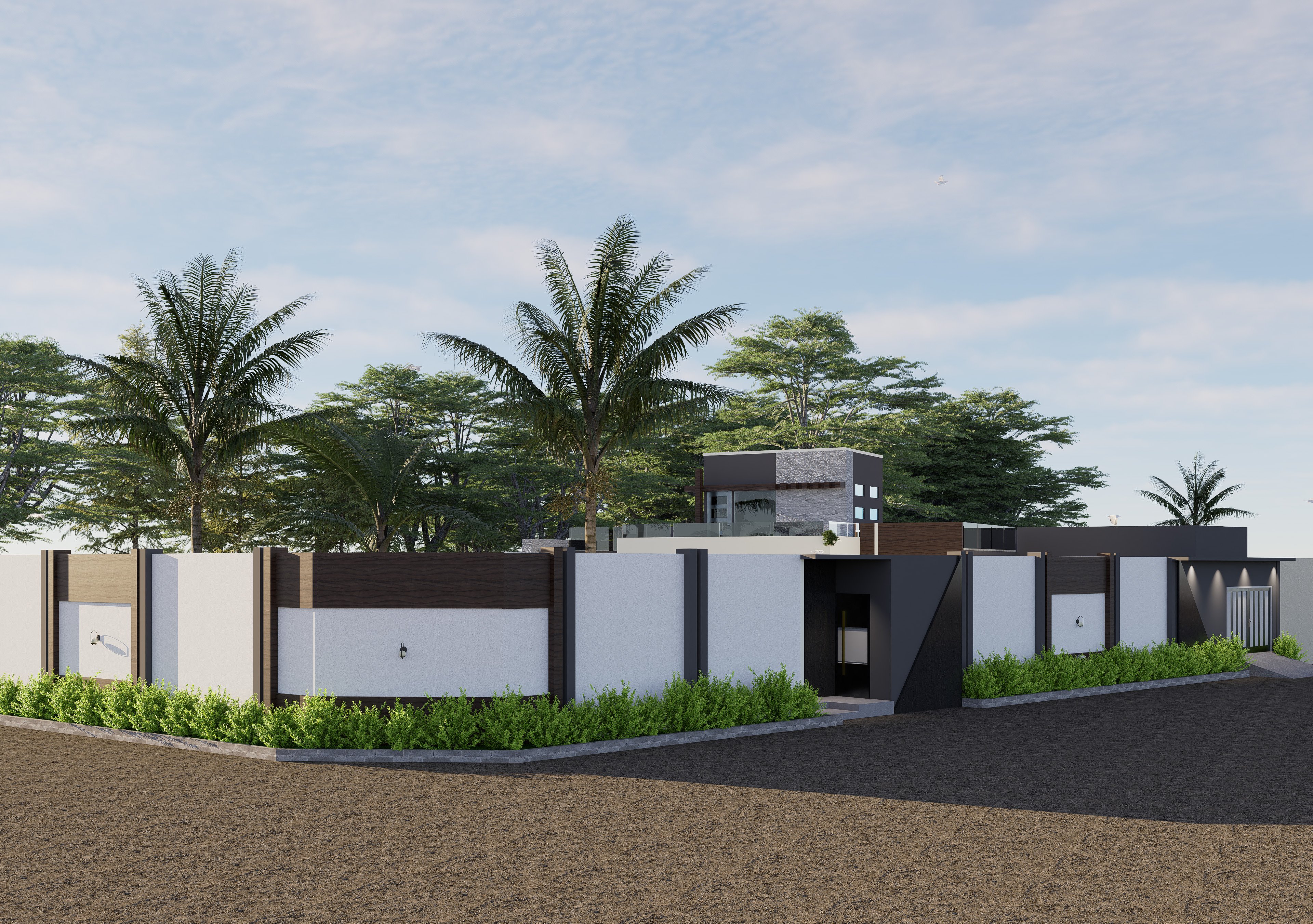 La rénovation a transformé la maison initialement inachevée en une habitation moderne et accueillante. Les espaces intérieurs sont fluides et lumineux, tandis que les aménagements extérieurs — jardin paysager avec palmiers, terrasse et pas japonais — renforcent l’esthétique et le confort. La création d’un garage pour deux véhicules, d’une guérite et d’une clôture repensée apporte fonctionnalité et sécurité. L’ensemble dégage aujourd’hui une identité harmonieuse et contemporaine, fidèle aux objectifs de modernisation et de valorisation de la maison.